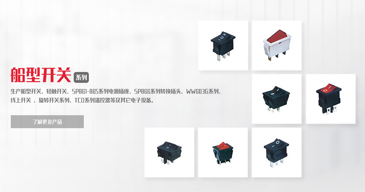 公司專業(yè)生產(chǎn)船型開(kāi)關(guān)、輕觸開(kāi)關(guān)、SP861-865系列電源插座、SP866系列轉(zhuǎn)換插頭、WW11系列微動(dòng)開(kāi)關(guān)、WW01-03、09系列按鈕開(kāi)關(guān)DS、WW系列指示燈開(kāi)關(guān)、WW603G系列 線上開(kāi)關(guān) 、旋轉(zhuǎn)開(kāi)關(guān)系列、TCD系列溫控器等及其它電子設(shè)備。